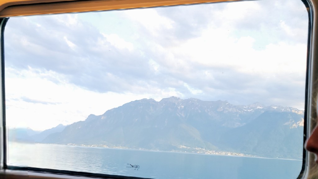 We passed through Montreux and Lausanne which, along with our destination city, lie on Lake Geneva. This gave us plenty of views of the lake and the mountains surrounding it. Very lovely, too bad these images were shot through a dirty pane of glass.