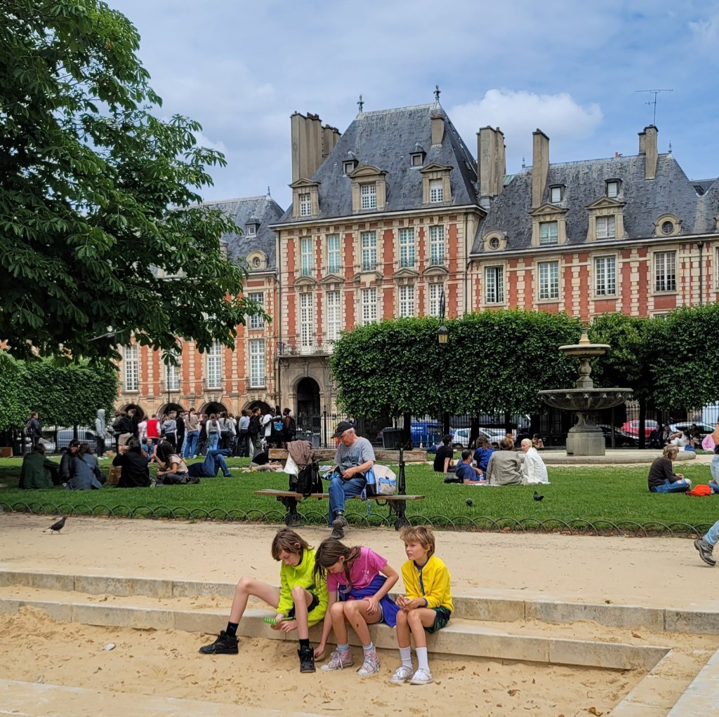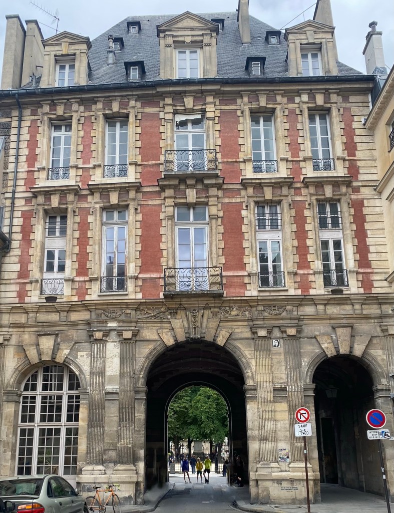 We left here for the oldest planned square in Paris which sits right in our neighborhood. It is called the Place des Vosges. Henry the 4th built it in 1612 and regularly had jousting tournaments here. Today, it was filled with students and other tourists enjoying the 4 fountains and the statue of Louis the 13th who succeeded his father, Henry IV, after his assassination.
