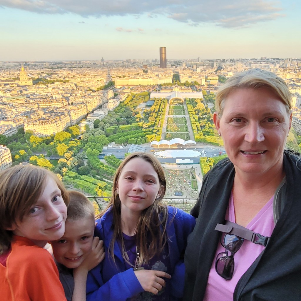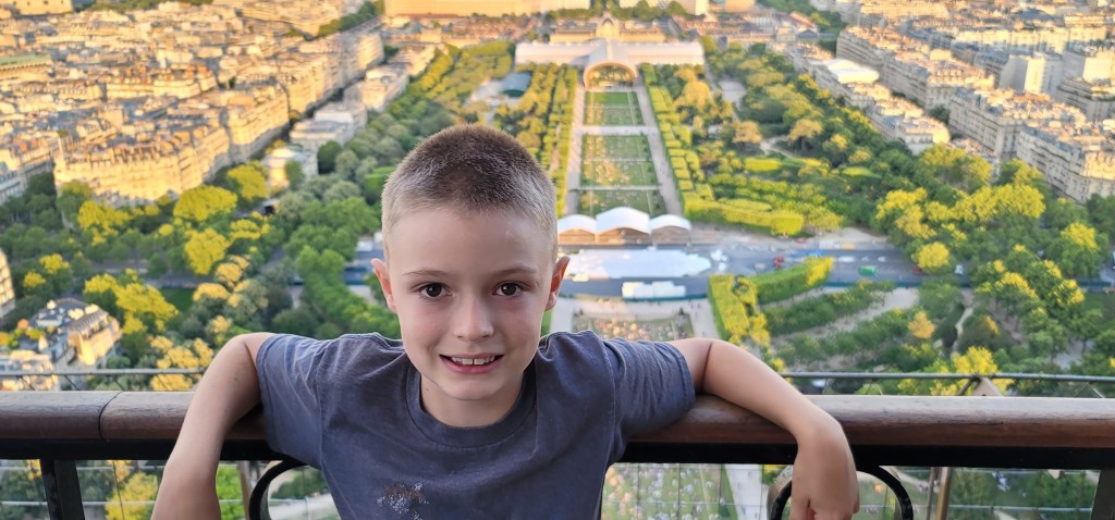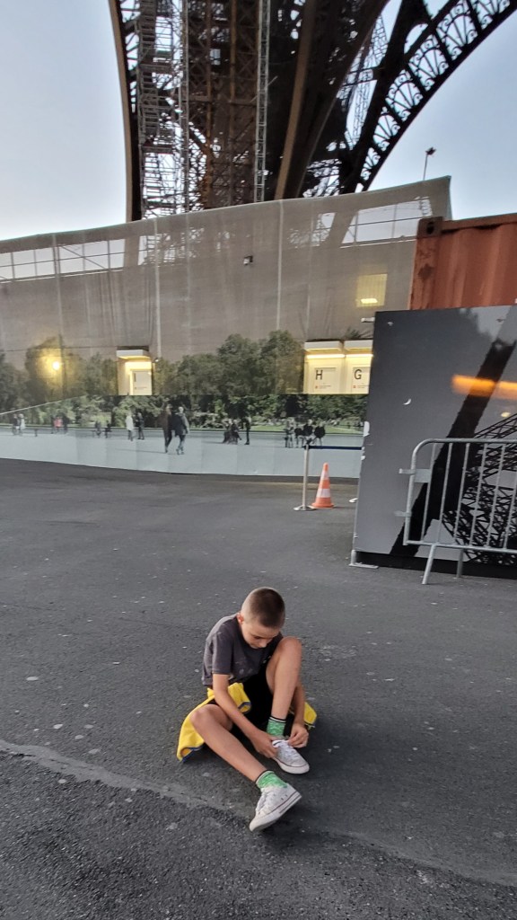 We have walked 34 miles (54 km) here in Paris this past week. Some of our walking today happened in front of and on top of masterpieces. And CreeperPuppy successfully tied his own shoe at Monsieur Eiffel’s iron masterpiece.