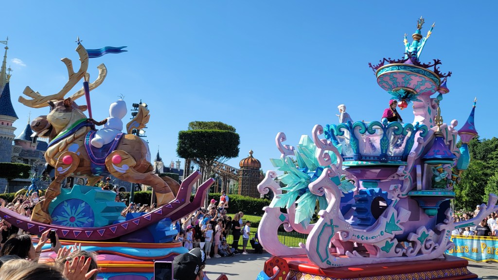 Besides la langue française, there were some other Disneyland Paris distinctions. Both parks have parades although last year we missed it due to Covid limitations. Today we were there long enough to see 2 of them. We were surprised to see Elsa and Anna close out the evening parade as the final float.