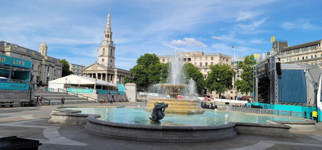 We also swung by Trafalgar Square. This space has been a significant London landmark for 800 years and remains the site for its most significant events. New Years celebrations, an annual Christmas tree, political demonstrations and this weekend a festival of free West End performances. We just saw that show in the process of tear down which did nothing for our pictures. Oh well.