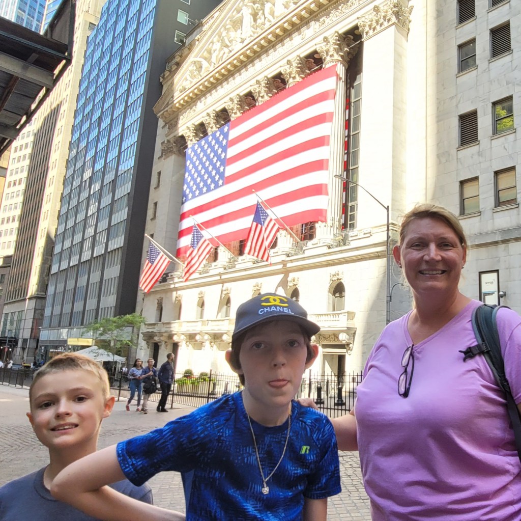 After we returned to Manhattan we worked our way through the narrow old streets of Lower Manhattan. We stood at the intersection of Wall Street and Broad Street with the NY Stock Exchange on one corner, the Federal Hall where Washington was sworn in as President on another. And on a third, the apartment building where Tiffany lived her last two years in NYC. True to form, the kids were equally bored by all those facts.
