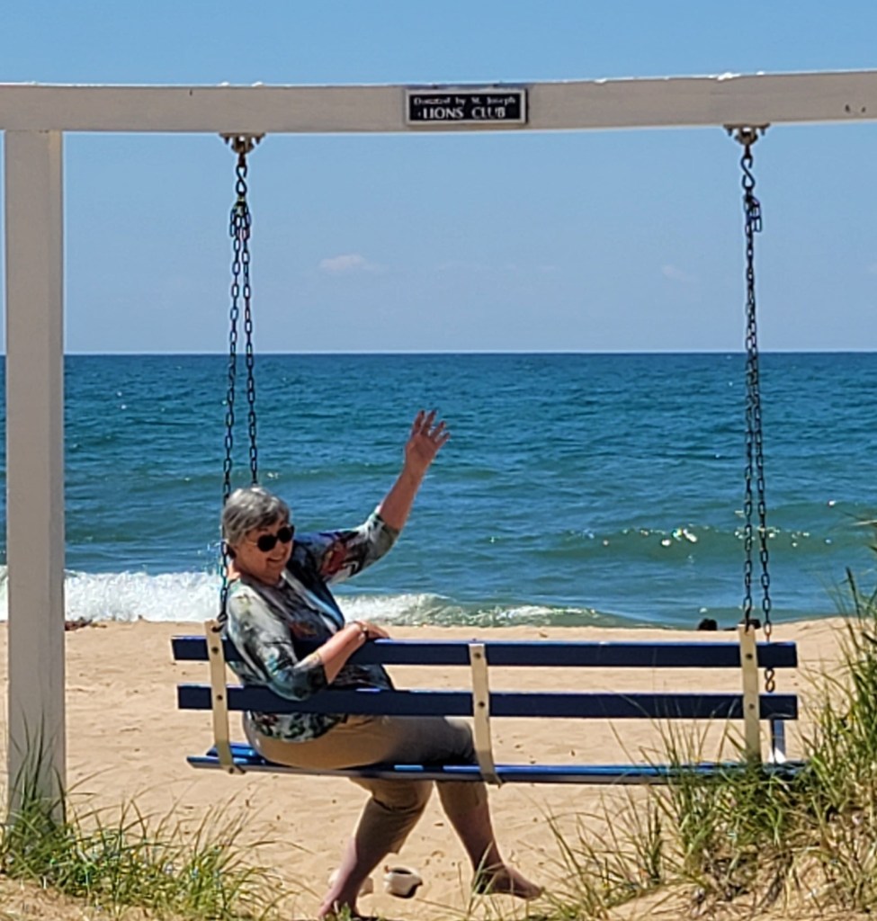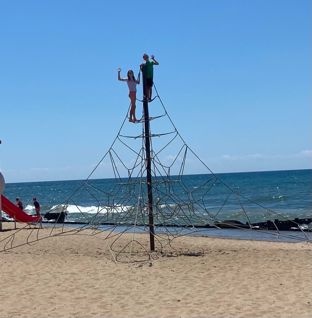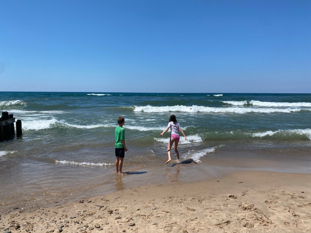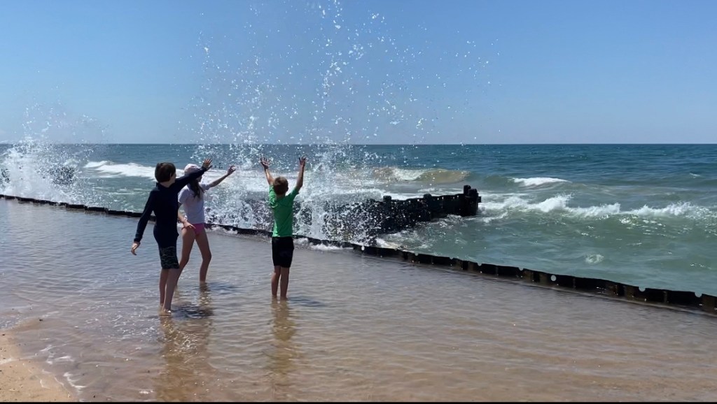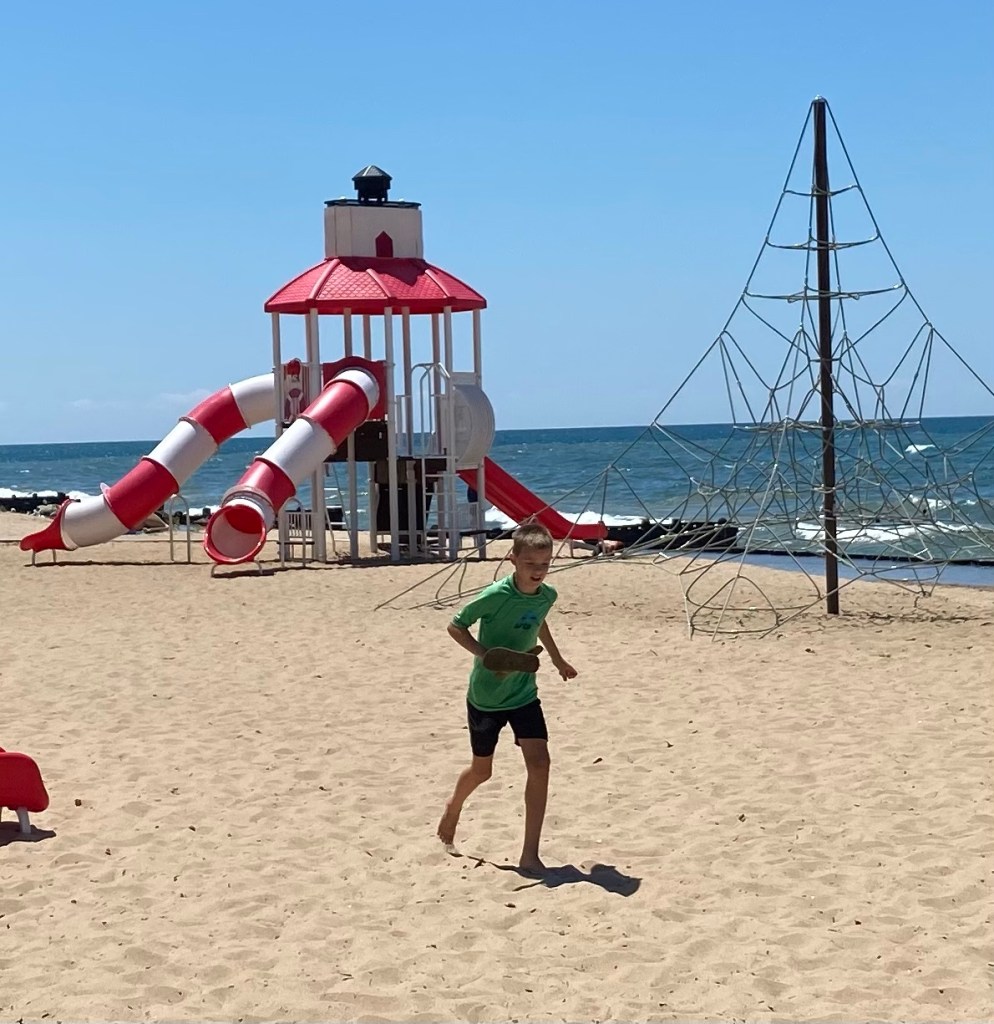 Our first stop is an old favorite in St Joseph and a place the kids recognized from our visit a couple of years ago – the Lion’s Park Beach. It has a lovely playground, a beach on Lake Michigan protected from erosion by sea walls and some nifty swinging benches.
