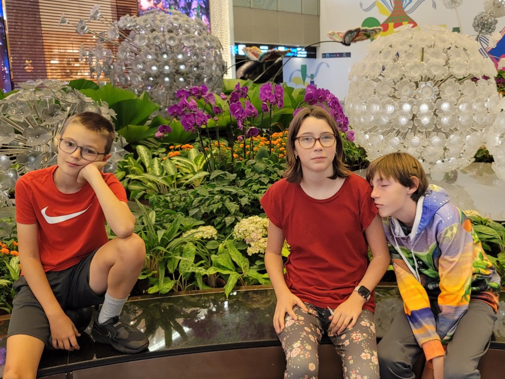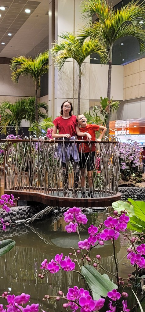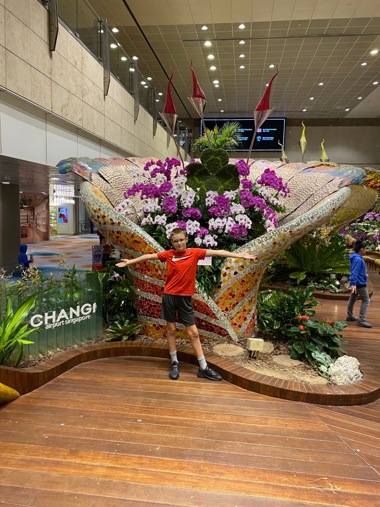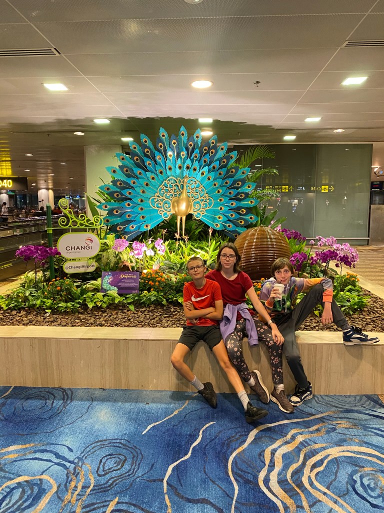 We arrived about an hour early and were happy to trade time on the plane with time in the airport. Singapore Changi Airport is recognized as one of the best airports in the world. It has free movies, a rain vortex, koi ponds, hedge mazes and all kinds of things to do. We did a couple of them but many are outside security and some took more energy/time than these travelers have. We definitely took it as an opportunity to get the kids back in the picture groove. They continue to be great sports about ‘grab a photo for the blog’.