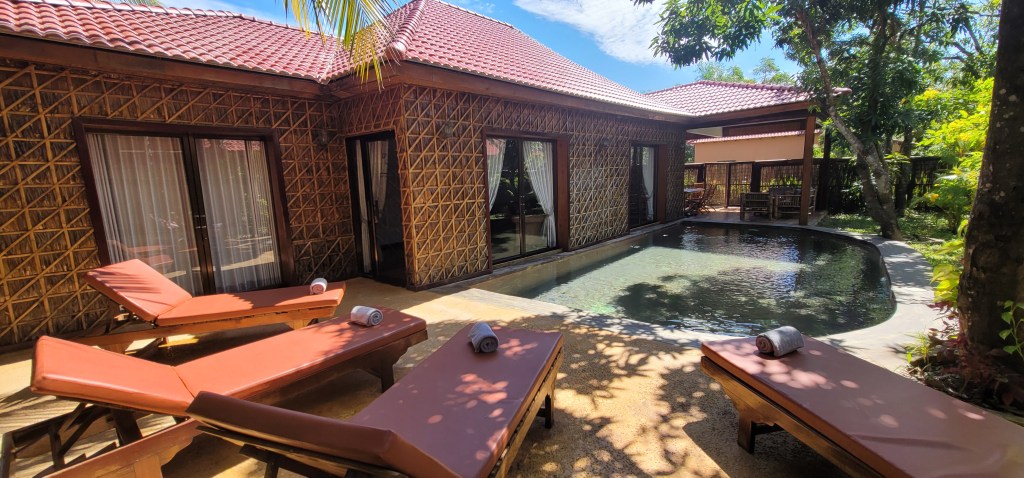 Our 3 bedroom villa has a lovely little pool and a pleasant patio area from which these words are getting composed.