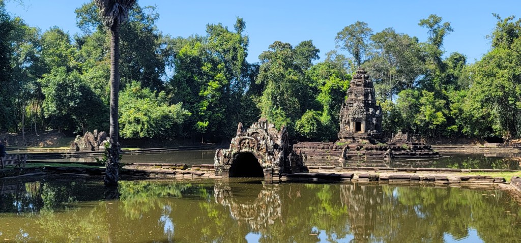 Neak Pean was a small structure in a pool surrounded by cleansing ponds representing the elements: earth, water, fire, and air. The temple itself is on an island in the middle of a large reservoir.