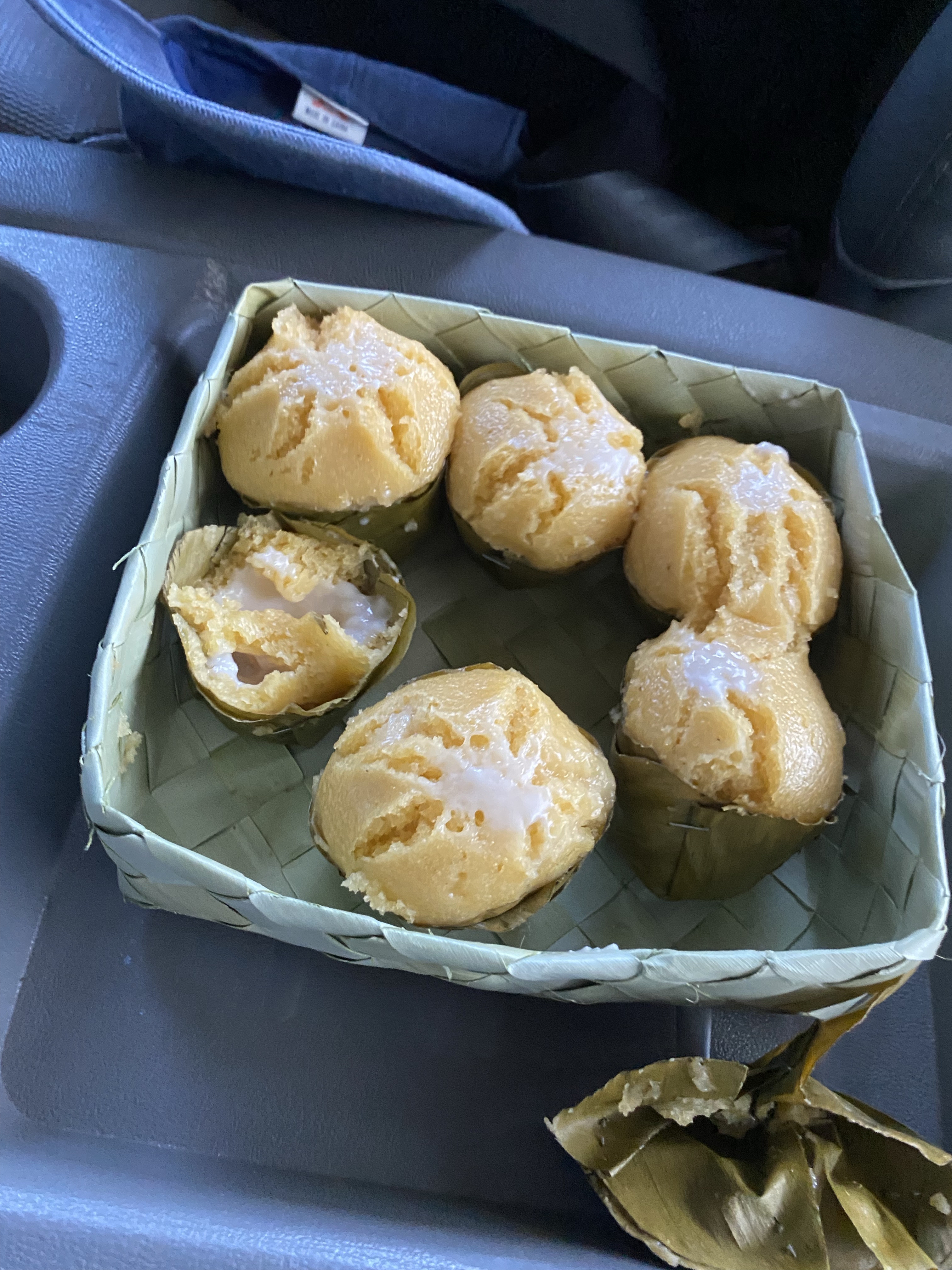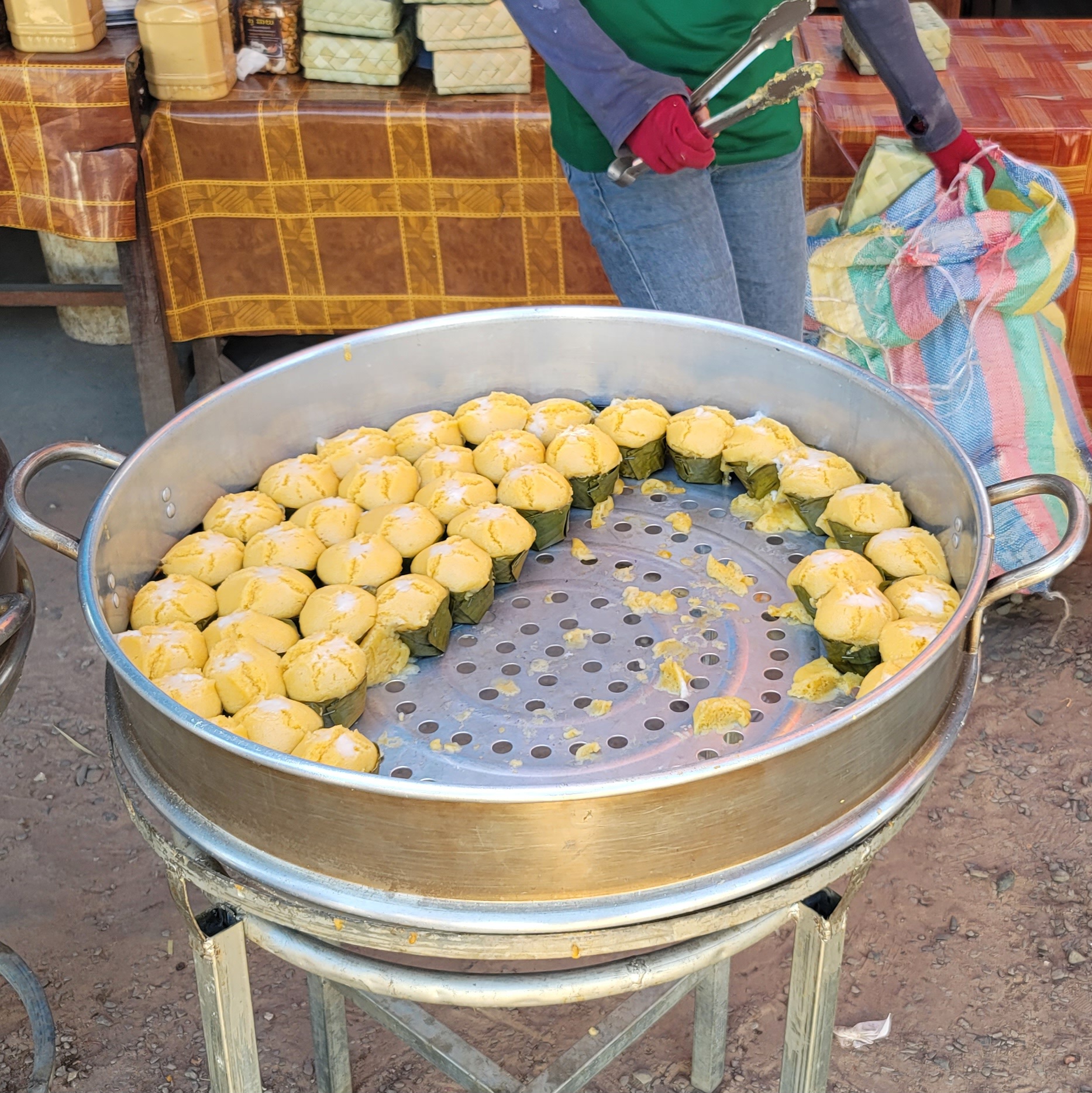 Our guide wanted to share not only her knowledge but also her country’s favorite dessert. On our drive to the next temple, we stopped at a roadside stand for Nom Akor, a sweet rice cake made with palm fruit and coconut. To our American palate it had a strange smell, a slightly rubbery consistency, and a good flavor. We enjoyed it but didn’t grab for a second.