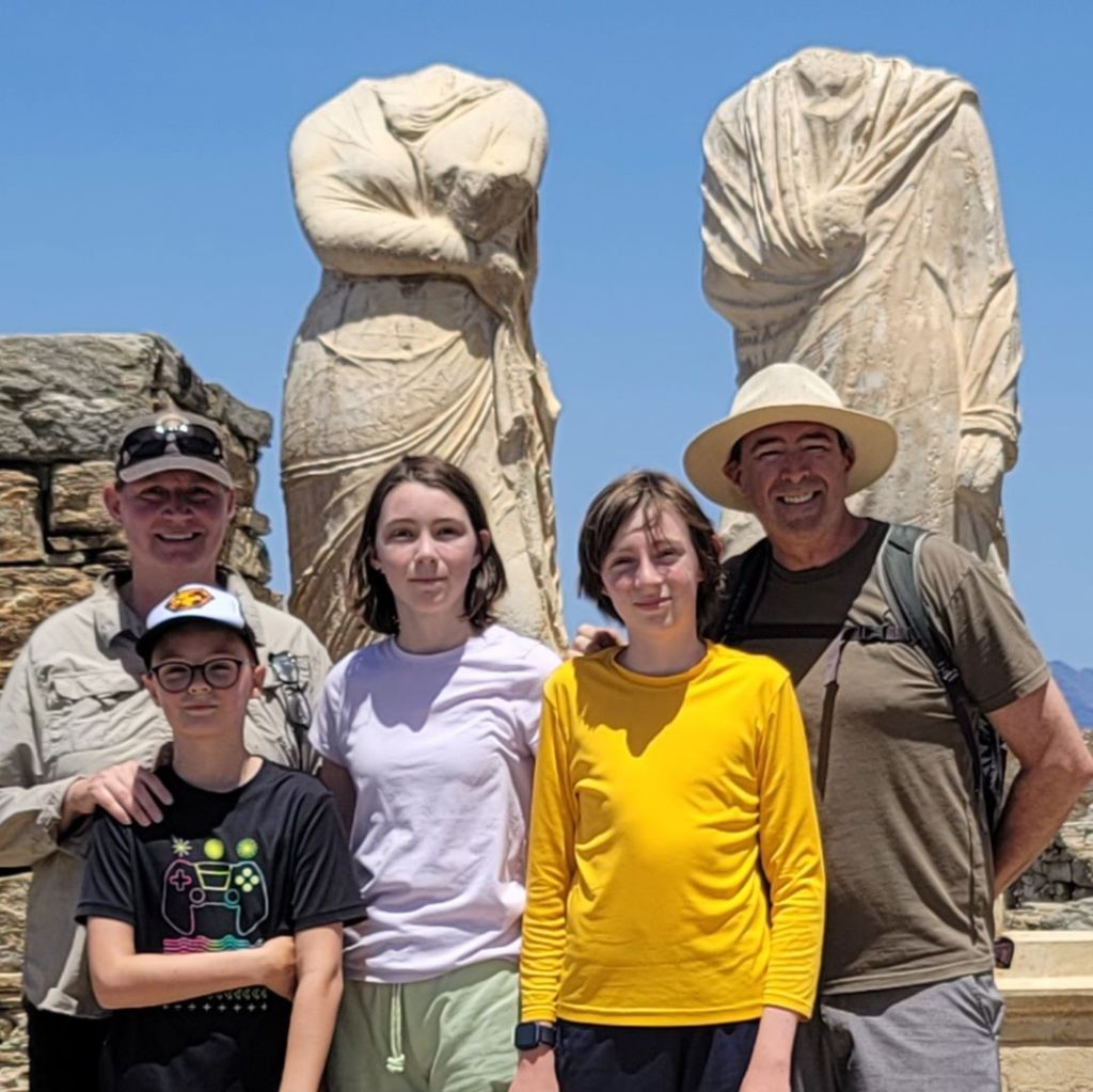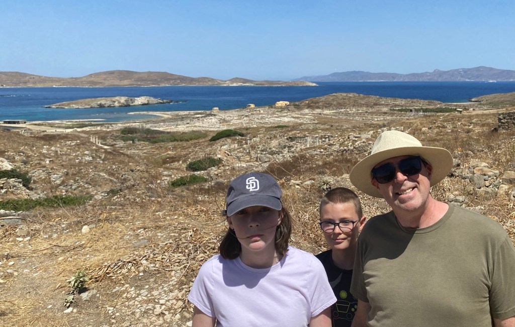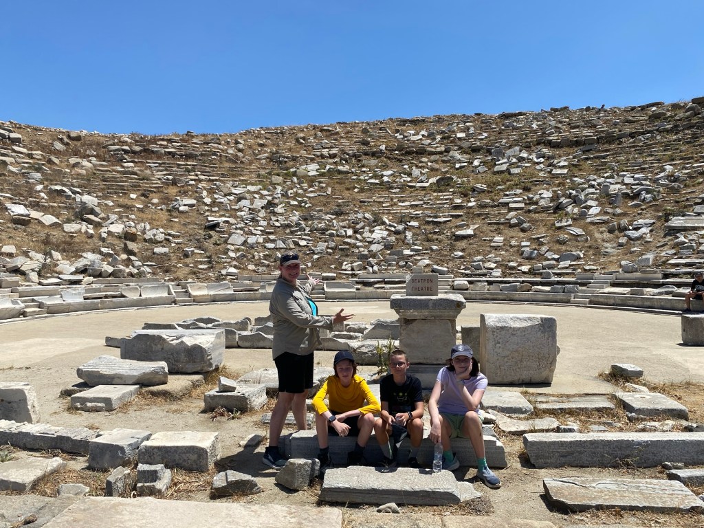The author Rick Riordan has created many stories and characters that bring mythological gods into the present day. Our kids first got hooked on The Kane Chronicles, which got them excited about Egyptian gods and seeing sights in Egypt, London and New York. Next, as a family, we listened to nearly 60 hours of audio on our long drives. This was to complete the five books in the Trials of Apollo series, which included Greek gods and some Roman versions as well. But the first and most famous of Mr. Riordan’s works is the series Percy Jackson and the Olympians. In the fifth book, Percy Jackson’s friends go to Delos on a quest. Since they went to Delos, today WE went to Delos. We also went to Mykonos, but that was just a bonus.