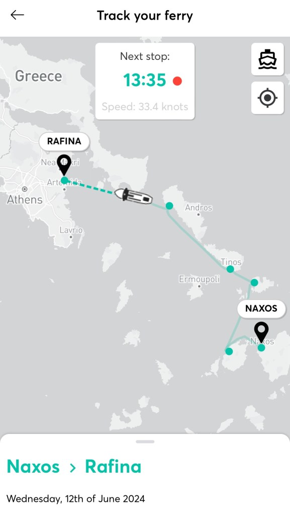We took a fast ferry but it makes 4 stops before arriving at the Rafina port near Athens. That makes it a 4.5 hour trip so plenty of time to do a little reading/napping/gaming etc.