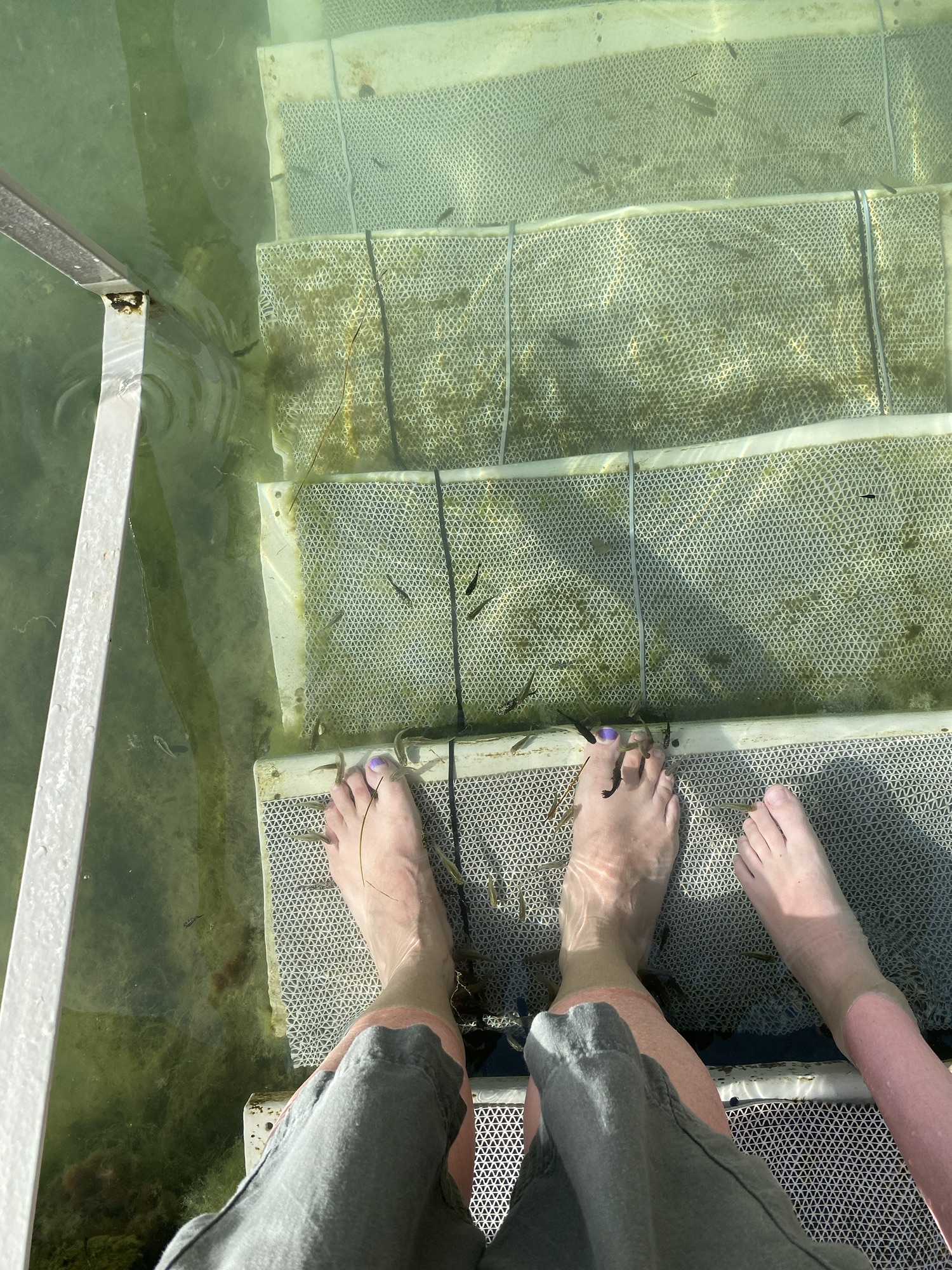 The lake has unique conditions that make it a popular spot. It is supplied with fresh seawater through underwater channels which keep it warm – 70 degrees or more. it also has a generous supply of small fish that are happy to nibble on your feet. Suaram was particularly thrilled with the fish, much like she was during her first fish spa in Thailand.