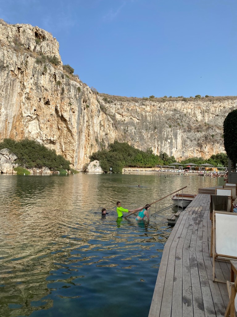 We wanted to squeeze another experience into the end of the day. We joined a small group tour with two stops. The first was Lake Vouliagmeni or ‘Sunken Lake’ about 30 minutes south of Athens. This lake was formed over 2,000 years ago when an earthquake collapsed a large cavern the walls of which are still discernible today.
