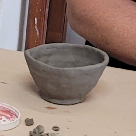 Emilia told us to take a knife to slice the top of the bowl and to remove this extra clay. This will leave the height of the bowl at an even level. The remaining clay can be rolled into a snake and then placed onto the top of the bowl. Smoothing the clay is easily achieved by wetting your fingers before rubbing the joint between the snake and the bowl. This is the pinching and coiling methods used in early pottery making.