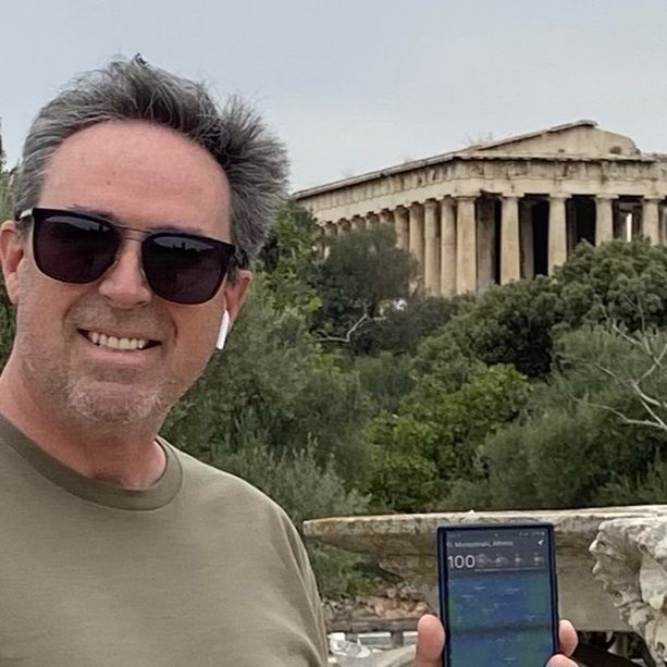 After getting the kids some dinner and another short break in the A/C of the apartment, Mom & Dad went out for a dinner date. Actually, it was their second date of the day. This afternoon they stole away to see the Ancient Agora and visit the Temple of Hephaestus. This temple is what yesterday’s Temple of Poseidon would have looked like had been reconstructed to its former glory. Here is Brian showing the temperature AND the temple in one shot. In his ear is the dulcet tones of our frequent tour guide Rick Steves who gave us info on the sights as we walked around.