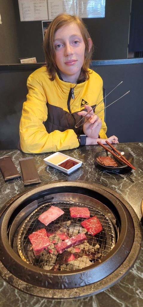 Afterwards we left the Samurai and Ninja Museum, excited by all the fun times ahead. Except now we were hungry, and the line for the nearby noodle bar seemed just too long. So instead we walked over to a meat restaurant. Something I wasn’t expecting about the place was that you got to cook your own meat.