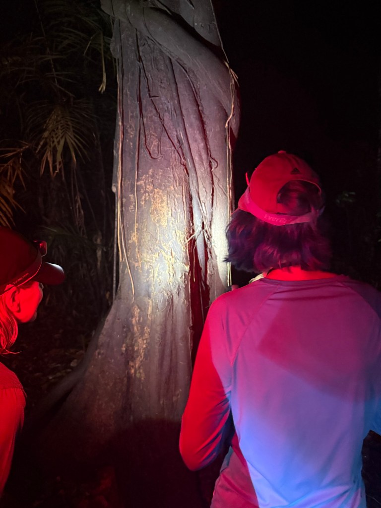 We settled into our rooms, explored the lodge a little and then met with our guide to plan our excursions for the next couple of days. We jumped right in with a short walk after dinner walk in the forest around the lodge. We got geared up in long pants, long sleeves, hats, headlamps, bug repellent and tall rubber boots and we were off.