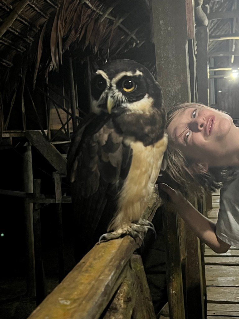 We got a great intro to the cool things we’ll see during our time here: green frogs, tree frogs, a scorpion, more cockroaches flying around than we could count, a shy tarantula and later a friendly one that came out and posed for our pictures. We saw leaf cutter ants, tiny preying mantises and one giant frog sitting at least 6 inches tall. Locally it’s known as a smoke frog and it was HUGE! And that was on the short walk. We also made friends with an owl that was just released from a rescue center that works with the lodge. It is very used to humans and is hanging around. Once it gets hungry enough it will have to move further into the jungle, but for now we get to see it up close.