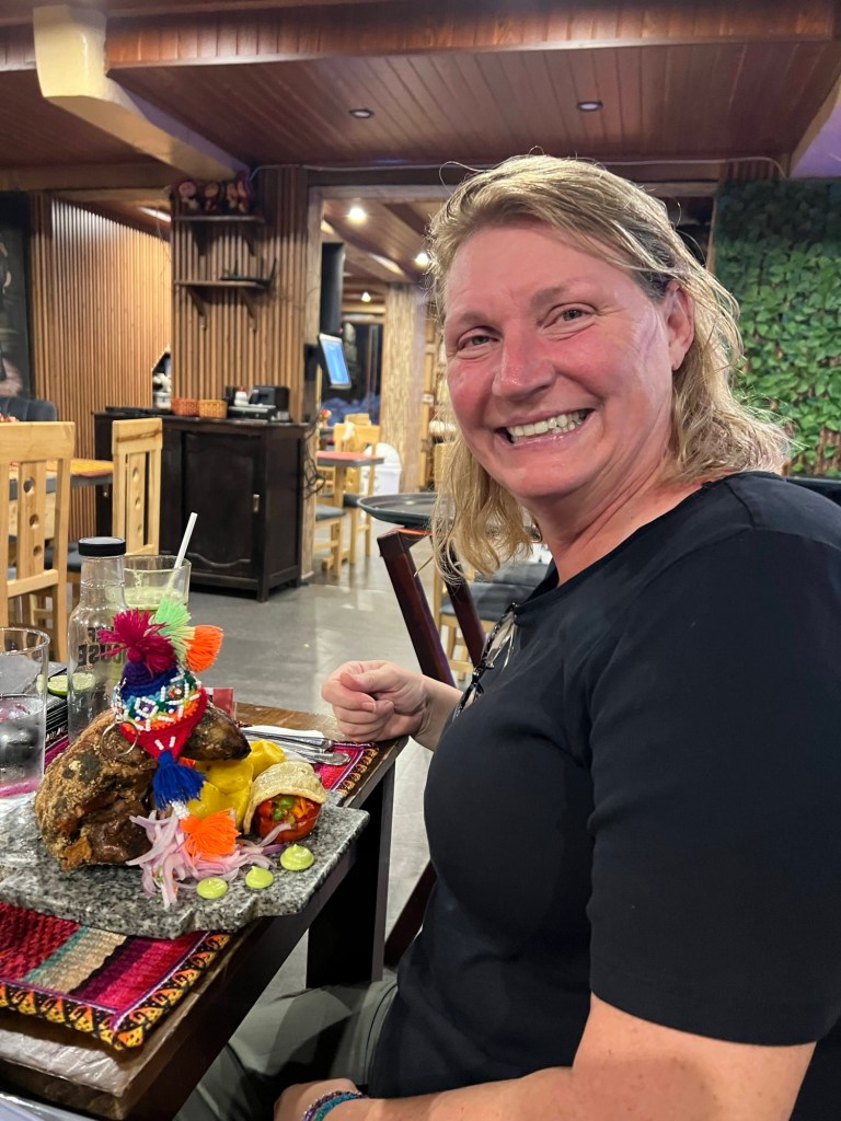 After our bus ride back down to town we found a lovely restaurant by the river for dinner. Peru menus often have some meat options that aren’t typically available in the United States. One is Alpaca.