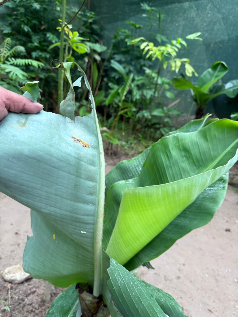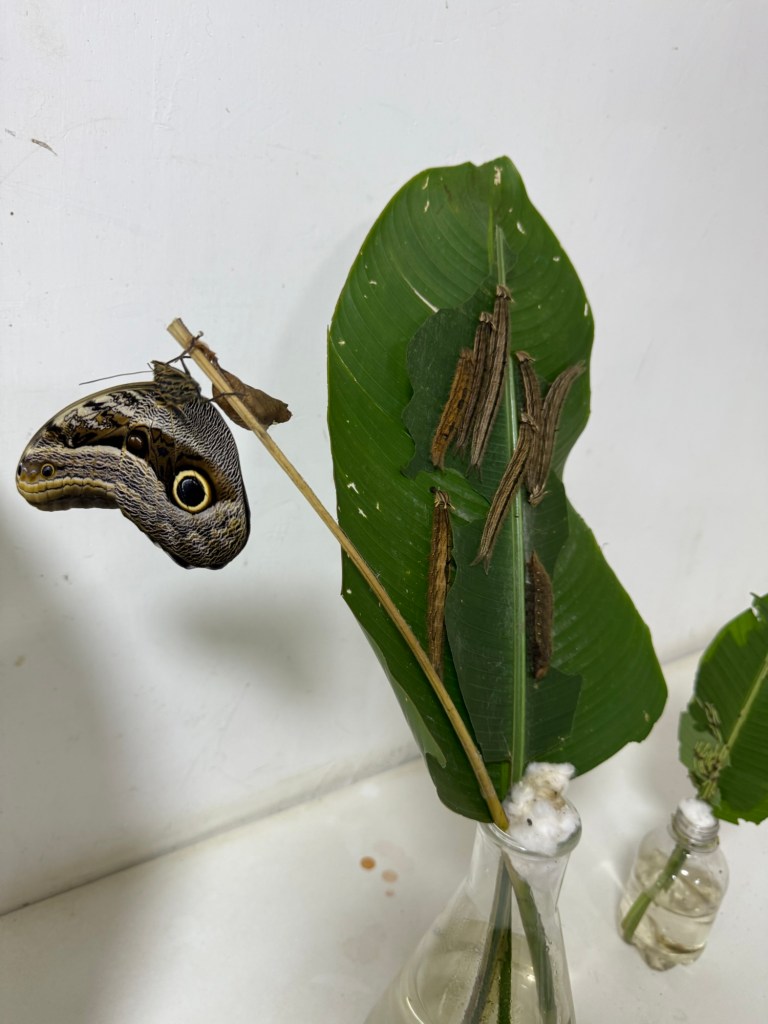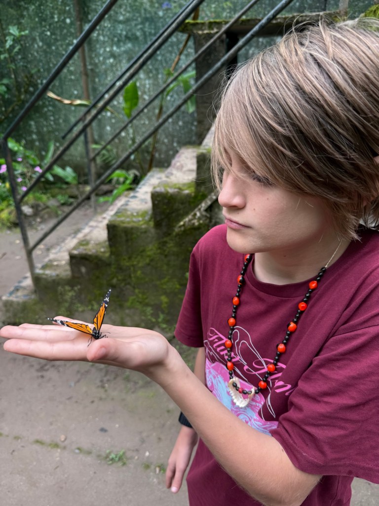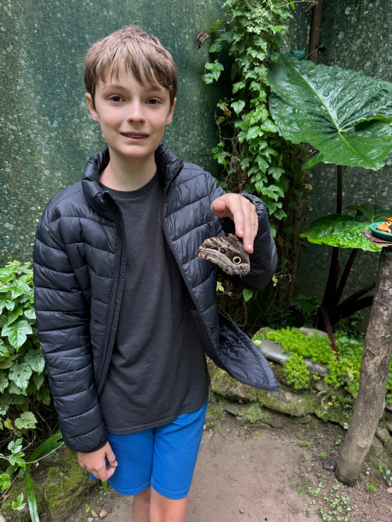 From there we went in the butterfly house so we could see them up close. Our guide demonstrated how they use their colors to camouflage to look like an owl or a snake to scare off predators.