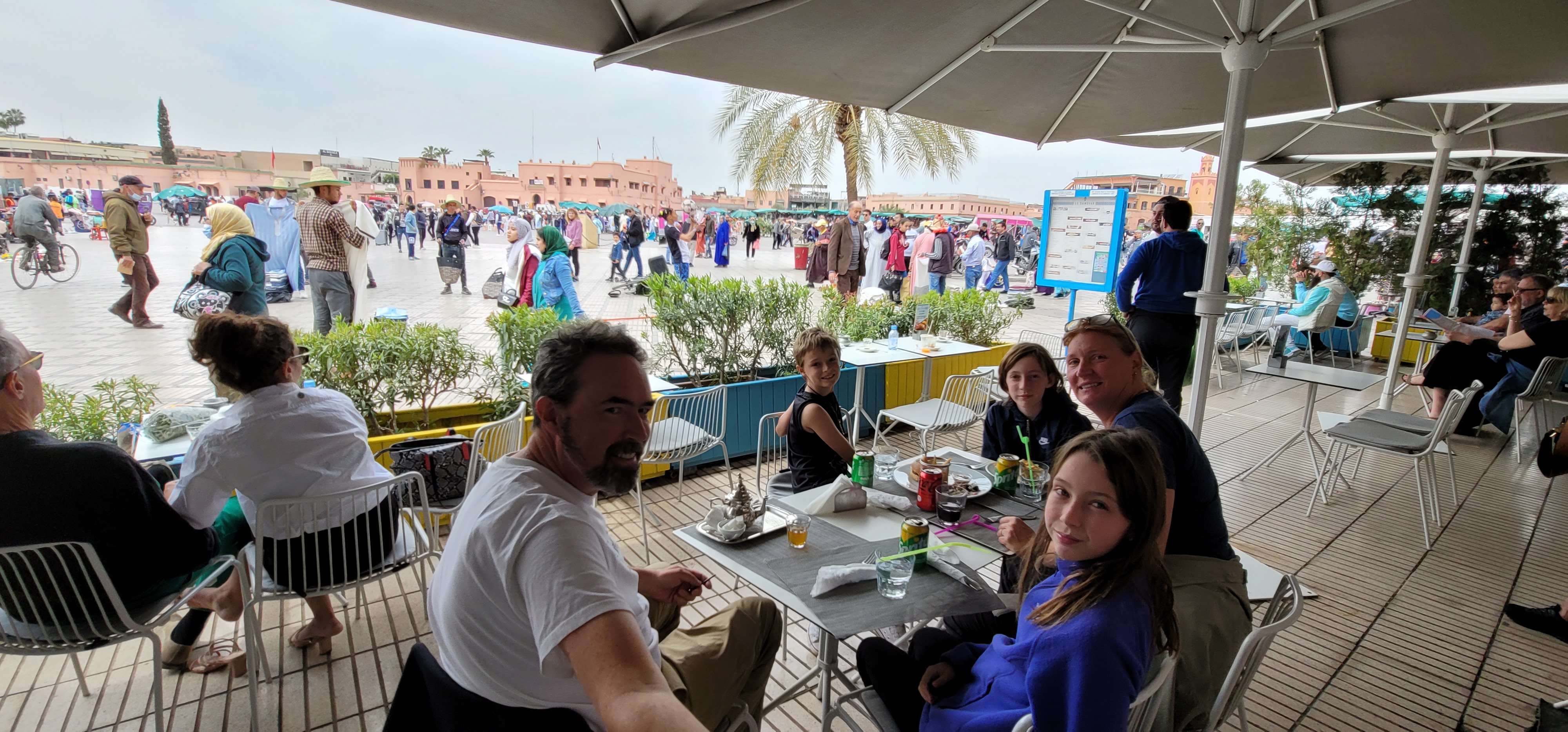 Today we enjoyed a wonderful lunch on the Jemaa El Fnaa square – the largest in the Medina. Two of us had traditional Moroccan dishes (Tagine Chicken & Lamb Couscous). The others had bolognese and cheeseburgers (not shown because, why bother?). The Jemaa El Fnaa is the famous Marrakech square which features snake charmers, musicians,…